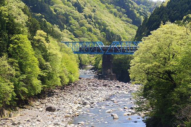 返しのトロッコを撮ろうと、第二橋梁へ。見事な新緑に感動する間もなく、返しのトロッコがやってきました。