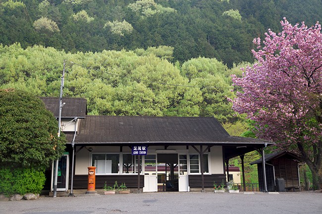 翌朝、朝練で足尾駅を訪ねました。満開の八重桜、パッチワークのような新緑が良いアクセントです。始発回送前の列車が停車していました。
