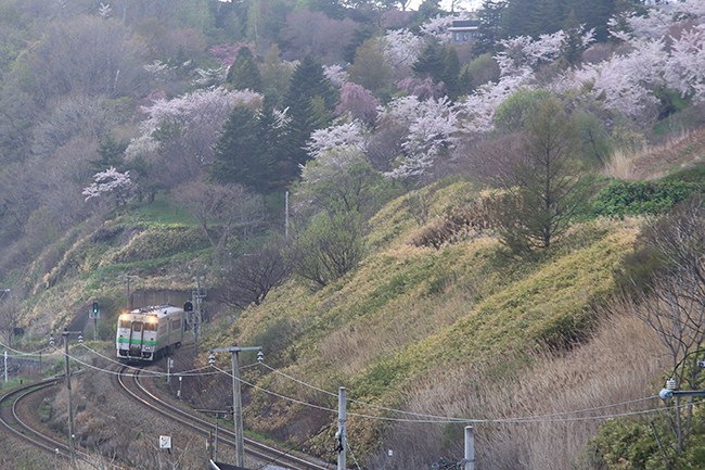 3日目、5/4は雨が止んだので、朝練にでかけました。初日のドライブで目星をつけていた桜と鉄道が撮れそうな洞爺の先のトンネル飛び出しの場所へ。始発は四ツ目でしたが、次の列車はキハ40。晴れていたらもっとエッジの効いた写真になったと思います。来年リベンジです。この後。天気が良さそうで、桜もちょっぴり期待して山線方面へ。