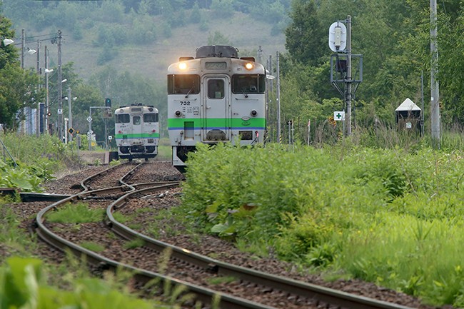夏の緑、雨上がりでしっとりと、小さな駅の交換風景。晴れたら完全な逆光なので、却って良かったかもと強がりを言ったりして。このあと、ご当地入場券販売駅を巡りながら、釧網本線に向かいました。
