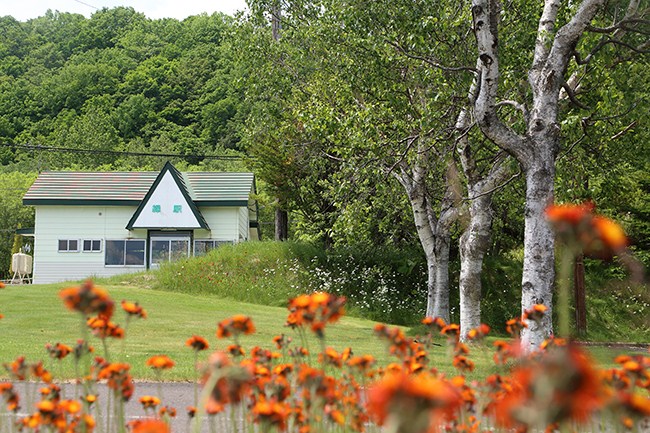 緑駅、その名に相応しい、緑に包まれた駅です。手前のオレンジ色のタンポポのような花、今回の旅ではよく見かけました。これも北海道の夏の野草なのでしょうね。まだ時間はあります。せっかくの機会なので、もう一度、サクラマスの遡上を見に行きました。