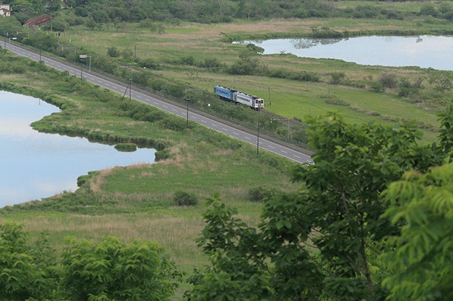 降りる頃には薄暗くなっているので、一人だったら登らなかったと思いますが、約20分の登山道を久しぶりに登りました。釧路行きは、昨日も撮影した流氷物語コンビ。湿原も緑多く、夏らしいシーンが撮れました。