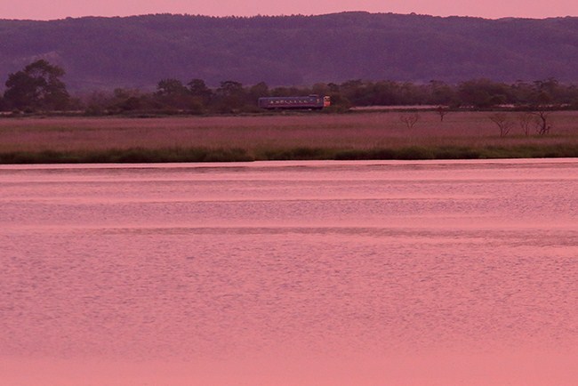 日が沈むと、空が焼けてきました。焼けた空で湖面も薄ら茜色。そんな条件の中、川湯温泉行き普通列車が通過しました。その後、空はさらに染まり、色もけっこう変化するという素晴らしい展開に。
