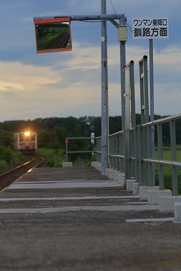 時刻は17時頃。西の空は夕焼け気味です。藻琴岳方面にレンズを向けて、南斜里駅の木造ホーム越しに、網走行き。このあと宿(斜里駅前)にチェックインです。途中、知床半島がシルエットになってクリアに見えました。「メシ、風呂!」の時間ですが、これはもう一丁撮るか!の展開です。