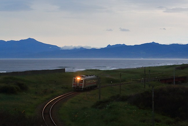 こんなに好条件になるなんて期待していませんでしたが、何とか撮りたいものです。しかし、次の列車は19時台。北海道の夏は長く、この辺りは緯度も高いので撮れるかもと、知床半島を見渡せる丘に登りました。止別19:06発の網走行き、十分な明るさです。