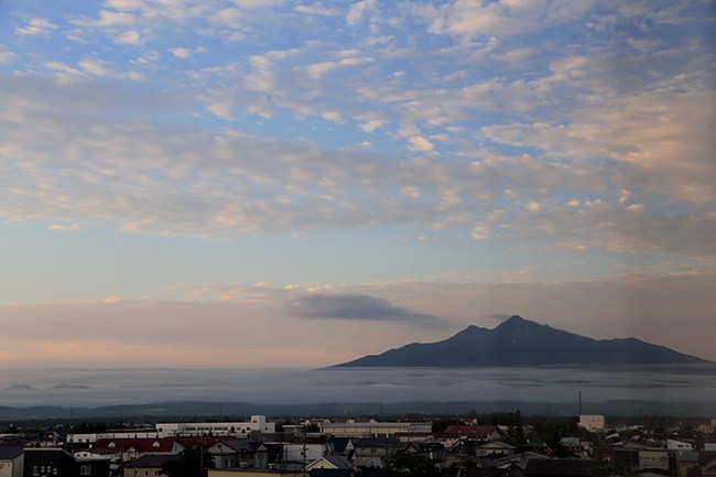 風呂に入って、22時には就寝。翌朝まだ4時頃でしたが、外が明るいので窓を開けると、ちょうど日が昇るタイミング。町全体が雲海のようになっていて、斜里岳がぽっかりと浮かぶ光景。素晴らしい1日になりそうだなぁと思いながら、二度寝しました。