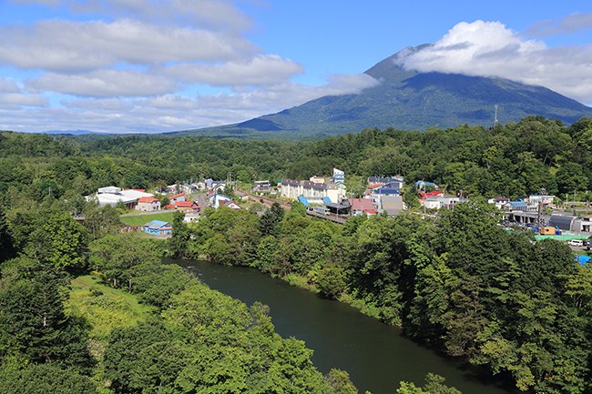 羊蹄山にかかる雲がいい感じ。なんとか山頂も見えています。尻別川の対岸にニセコ駅を据えて、停車中の普通列車を入れました。いちおう鉄道写真です。