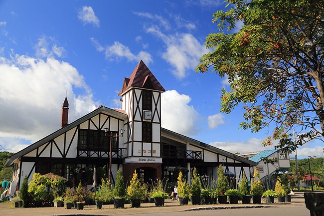 快晴、晩夏のニセコ駅。今年も、10月には駅前がカボチャで埋め尽くされるほどになりますね。