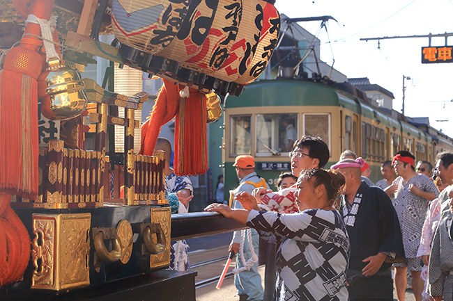 腰越通りを祭りの行列が通過するのは限られた時間。もう一度300形と一緒に撮りました。
