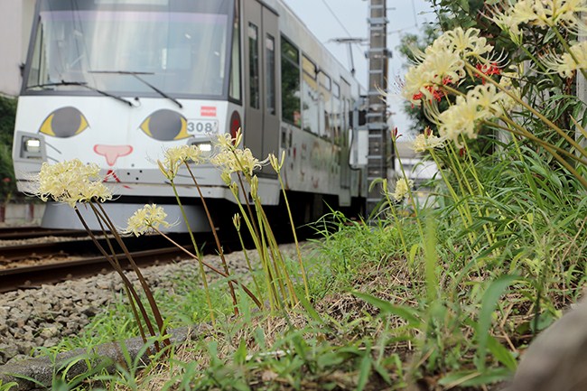 招き猫電車、最後のコラボは白い彼岸花。世田谷線を撮り終えて、京王線、山手線を乗り継いで大塚駅に向かいました。
