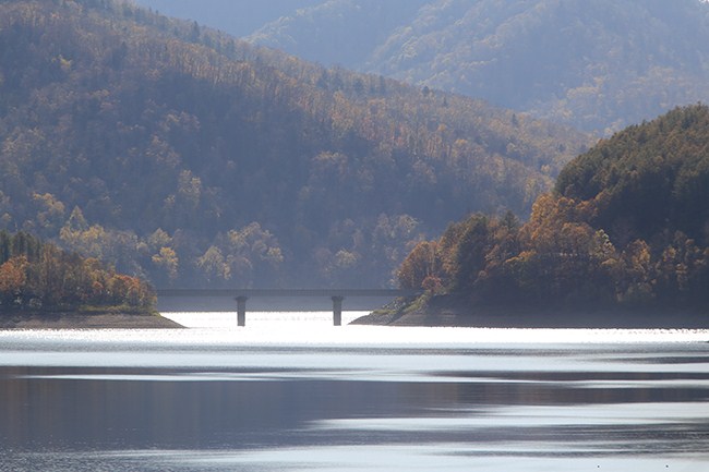 金山湖を渡る鉄橋に日が差して、非常に良い感じ。しかし、ここを列車が通過するのは午後3時。まだ2時間半あります。さて、先を目指すか、2時間半待つか‥。2時間半待つことにしました。