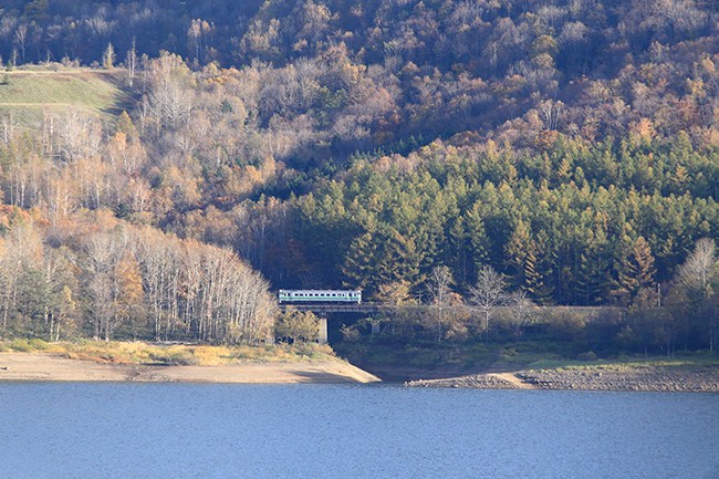 肝心の金山湖を渡る橋は陰ってしまいましたが、夏にラベンダーを撮った小橋の辺りに日が回ってくれて、いい感じ。数分後には、東鹿越から折り返してきます。