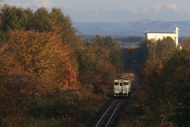 前夜タラコが新得に行ったことを目撃していたので、タラコを期待しましたが、新得始発の普通列車は北海道色。朝日を浴びてやってきました。線路端の木々は紅葉ピーク、雪を被った奥山(十勝岳連山)も見渡せます。