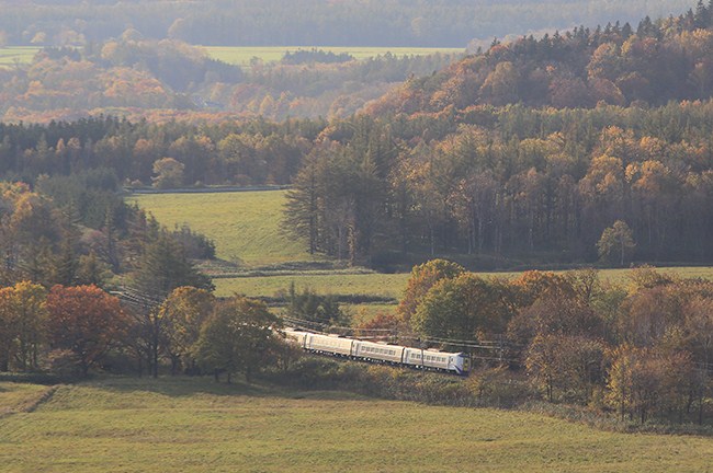 前日の増田山は日が陰ってしまったので、リクエストして再度増田山。半逆光の中、始発札幌行きのスーパーとかちのステンレスボディが朝日に輝きます。