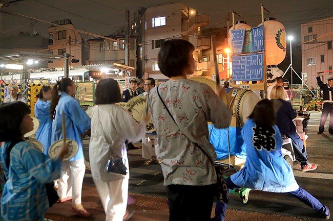 目白通りから、鬼子母神参道に続く道路に入り、万燈行列がやってきました。独特のリズムの笛と太鼓が、全身に響きます。鬼子母神前で荒川線の線路を渡り、鬼子母神に向かいます。