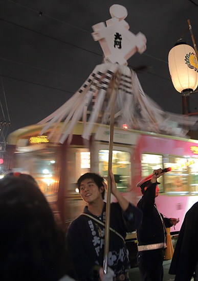 この行事を撮影するのは、これで4回目です。経験上、万燈を迎える側(踏切の反対側)だと、車両との距離感が近すぎて、万燈行列の熱気が伝わりにくいことが分かっていたので、今回は終始、行列側で撮るようにしました。