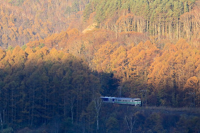 前回の鉄旅から半月が経過したこの季節、いちばんの期待は落葉松の紅葉です。道東では随所で見られますが、この辺りだと限られます。朝練は礼文の峠に直行しました。予想通り、黄金色に色づいた落葉松林を抜けて、朝の三連。先頭と2両目は40系なのは良かったのですが、朝日が当たりきらず、まだらになってしまいました。