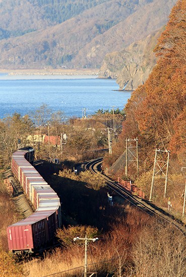 いつもの豊浦のカーブは、秋色たっぷりです。年によってはこの時期に初雪が降り、淡い雪景色になりますが、今年は暖かく季節の進みがゆったりしています。貨物列車の長大編成は、後追いなりに絵になります。