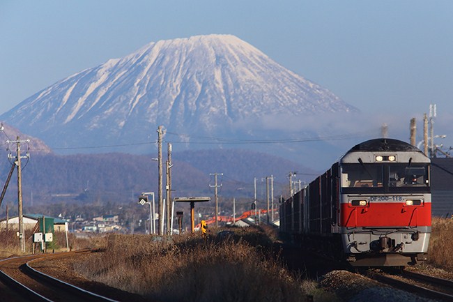 何だかこの朝は、黄金からの羊蹄山は当然見えるだろうと安心して思うほど、極上の天気でしたので、確認することなく朝練の最後に立ち寄って、「やっぱりね。」 でも嬉しいものです。8時過ぎの3057レを撮りました。羊蹄山は例年と比べ雪が少なめです。
