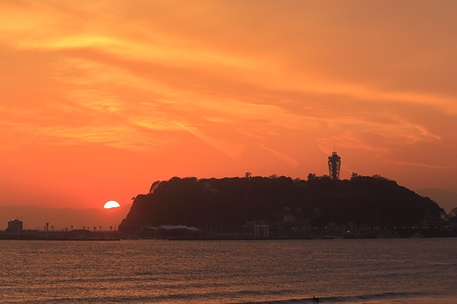 鎌倉高校前から。江ノ島に日が沈みます。多めの雲が空を染めます。