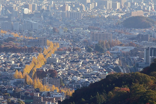山麓と山上の中間あたりにある金毘羅展望台に行くためです。ここも絶景です。眼下には八王子の街並みが広がります。黄色い銀杏並木は甲州街道ですね。