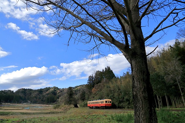 次の下りが来るまでたっぷり時間がありました。いろいろ歩いていい運動になりました。やってきたのは単行列車。通過時に日が陰ってしまいましたが、銀杏の枯れ木を入れて、12月の上総大久保です。