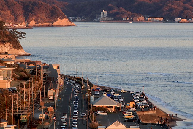 藤沢から戻ってきた300形を捉えます。七里ヶ浜駐車場の先に広がるのは、稲村ヶ崎、由比ガ浜