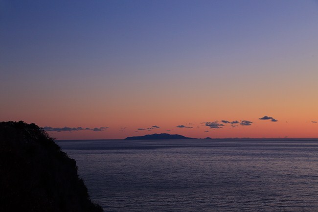 角度がある場所からの伊豆大島、夕景です。茜色の空に、微かに海も染まります。