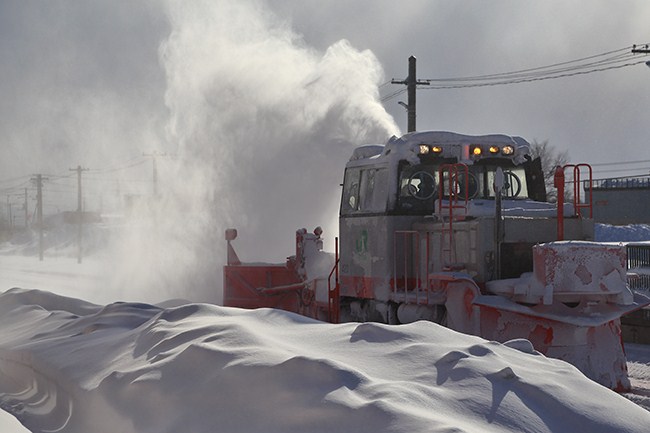 士別駅の構内を出て、駐車場に戻ろうとしたとき、豪快に雪を巻き上げる除雪車がやってきました。駅構内の除雪作業でした。何だか得した気分♪