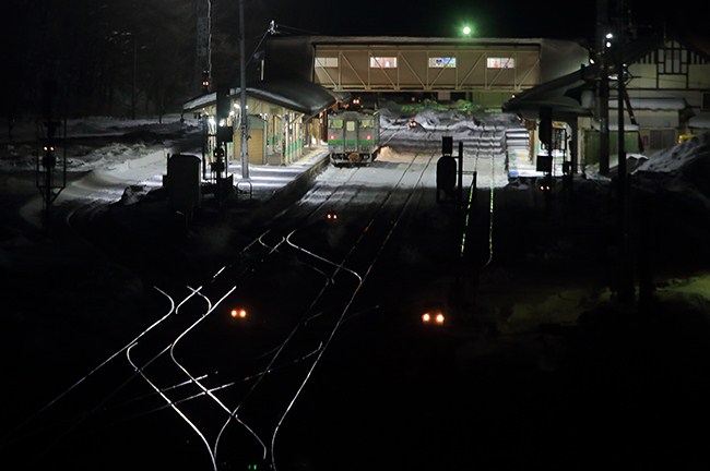 旭川から遠軽までは、無料の高速(紋別道)が瀬戸瀬まで延伸し、時間的には近くなりましたが、気分的には別の地方に来た気分です。久しぶりの跨線橋からの駅の眺め。駅と停車中のキハが浮かび上がるように見えます。まだ18時台なのですが、深夜のように静かです。