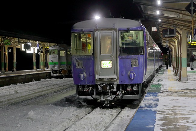 先ほど跨線橋から見えた普通列車(キハ40)とキハ183(オホーツク)との並び。スラントノーズ車が無くなったのは寂しいですが、平成が終わり次の元号を迎えようとしている今、昭和の時代の国鉄車両の並びが見られるのは貴重と言えます。