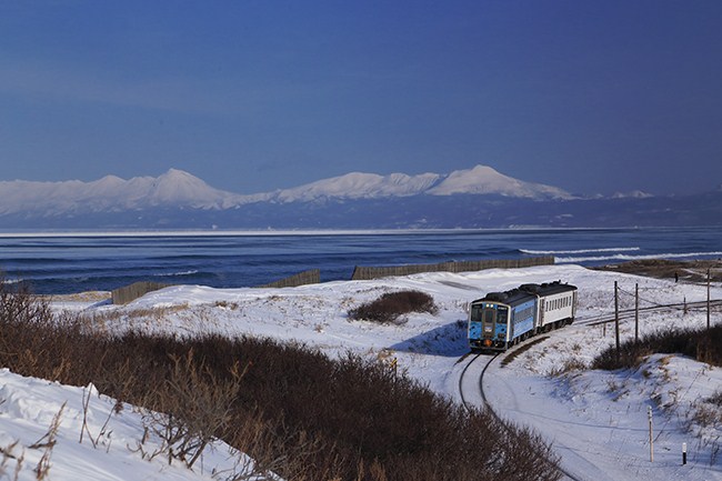 残念ながら流氷は沖ですが(白い線のように見えるのが流氷)、青空に知床(羅臼岳)がくっきり、弧を描く線路を流氷物語号。この車両は、引退した流氷ノロッコの後継車で、キハ54のお手軽ラッピング車ですが、なるほど、この景色に非常にマッチする上手なデザインです。リクライニングの54を活用し、お金をかけず上手に観光列車を作ったものだと感心しました。