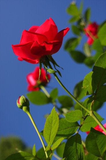 赤いバラには青い空