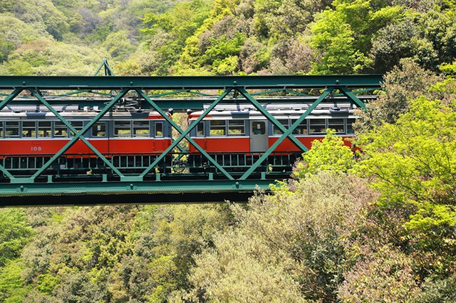箱根登山鉄道 塔ノ沢(2014年4月) 桜 も終わり、汗ばむ季節になりました。秋の新車デビューを控え、旧型車両の去就が心配でしたので、いつもの紫陽花シーズだけでなく、今シーズンは四季を刻む心づもりでした。新緑が眩い出山の鉄橋でした。