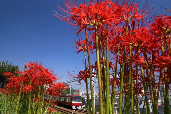 京浜急行 横須賀中央・県立大学(2015年9月) 2015年はシルバーウィークが5連休。その初日は見事な秋空の下、彼岸花咲く京急沿線へ出かけました。青空に赤い花と赤い電車、同じ場所で約2時間粘りました。雄大な北海道とは好対照ですが、こうして近場で旬な季節を捉えるのもまた楽しいものです。