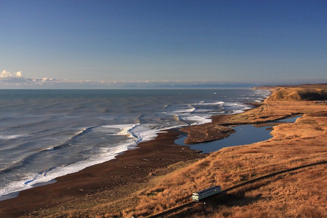 朝一番の太陽を浴びて、下り単行列車。寒さも気にならない、気分最高の朝です。(2012年11月)