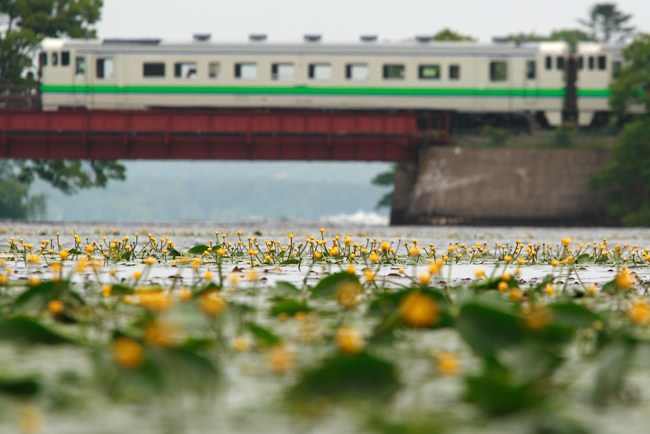 こんなに見事なコウホネの群生は見たことがありません。しかも函館本線も一緒に撮れるなんて。