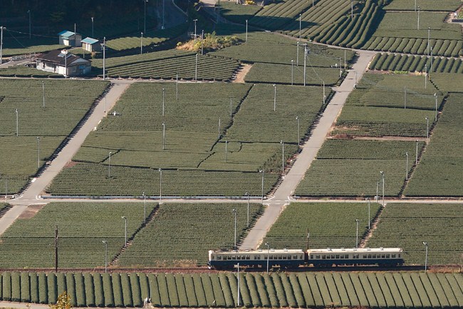 見下ろせば、一面の茶畑。初冬の川根路を行く近鉄421