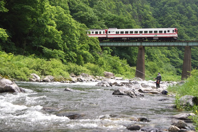 鮎解禁( 山田線 陸中川井) 朝の岩泉線が終れば何もすることがない。訪問した日がちょうど鮎解禁の日で太公望で賑わう閉伊川。日中はほとんど来ない山田線。川原でうたた寝し、弁当を食べる。そしてようやくやってきた列車を撮る。のんびりと至福の時間だった。2007.7.1 ⇒収録アルバム「聖地深緑」 <EOS 20D Canon EF24-105mm F4L IS USM>