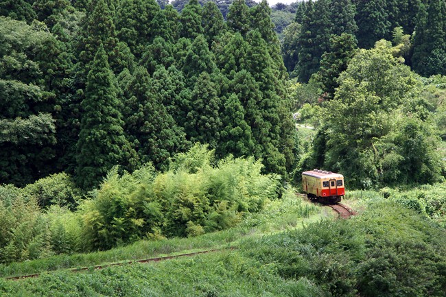染入る夏の緑(小湊鉄道 上総大久保) 新緑以来の小湊鉄道、上総大久保。定番カーブを望遠で覗いたら、3×2ピッタリに収まっていて、染入る夏の緑! おぉ、これだ。単行が似合う光景である。2007.7.16 ⇒収録アルバム「染入る夏の緑」 <EOS 20D Canon EF24-105mm F4L IS USM>
