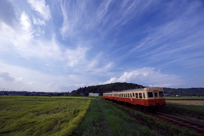 夏のフィナーレ(小湊鉄道 上総鶴舞) 夏の締めは小湊。今年の夏は何となくそんな展開になった。収穫を待つ稲穂が見事だった。曇ったりスコールがあったりの不安定な展開だったが、夕刻間近になって、いい雲がでてきた。広角の出番 2007.8.25 ⇒収録アルバム「晩夏のゴールデンウィーク」 <EOS 20D Canon EFS10-22mm F3.5-4.5 USM>