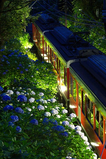 ライトアップまで粘ったおかげで、いい絵が撮れました。駅ではないですが、電車はここで停止してくれます。乗客も撮影者もにっこり!