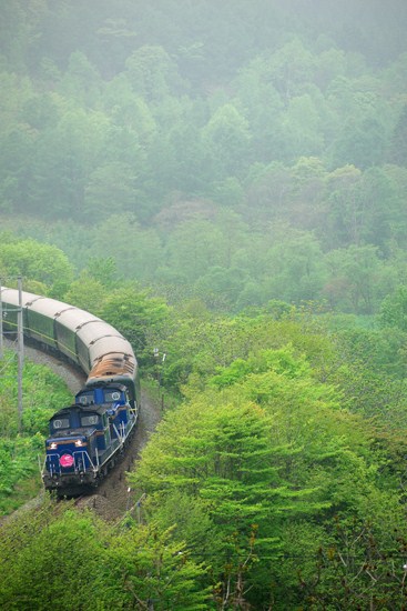 朝の礼文華の森。濃い霧の中、下りトワイライトエクスプレス、定時に通過。