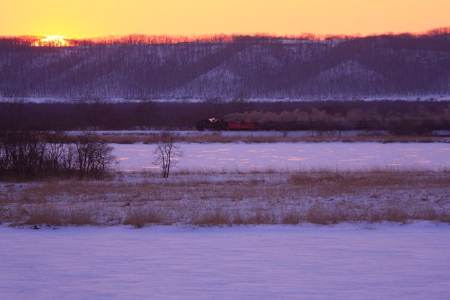 この日の湿原号は川湯温泉まで延長。日没のタイミングで、シエルトロ湖畔を通過しました。