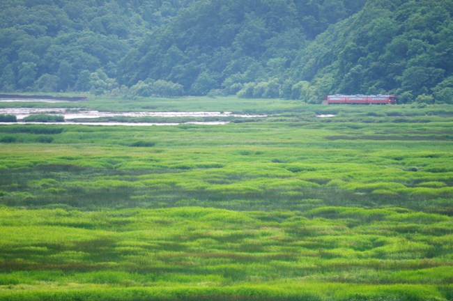 緑のビロードを敷きつめたような夏の湿原を行く、紅一点の臨時列車(快速 北太平洋 花と湿原号)です。