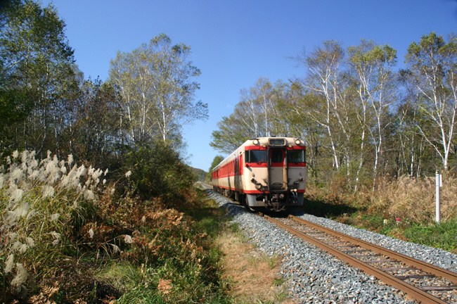 秋の高原。山田線の締めは、いつもこの白樺の踏切でした。