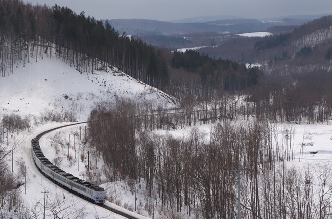 冬の終わりの強風の丘から。大きく弧を描いた線路に沿って、オホーツクはゆっくりと峠を登る
