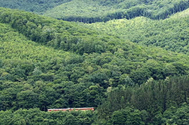 線路らしき方向にレンズを向けると、初夏の深い緑の中から、列車が一瞬顔を出した