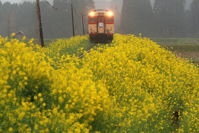 菜の花&いすみ鉄道 (小谷松 2017年4月) いすみの菜の花からもう1枚。生憎の雨で、傘をさしながら待ちました。普段ならモチベーションが下がるところですが、圧巻の菜の花と、やってくる車両への期待から、ワクワクしながら待ちました。