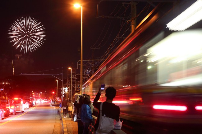 江ノ島恒例、秋の花火大会。秋の夜空にドーンと花火が上がるタイミングで、12分間隔の江ノ電が通過してくれました。